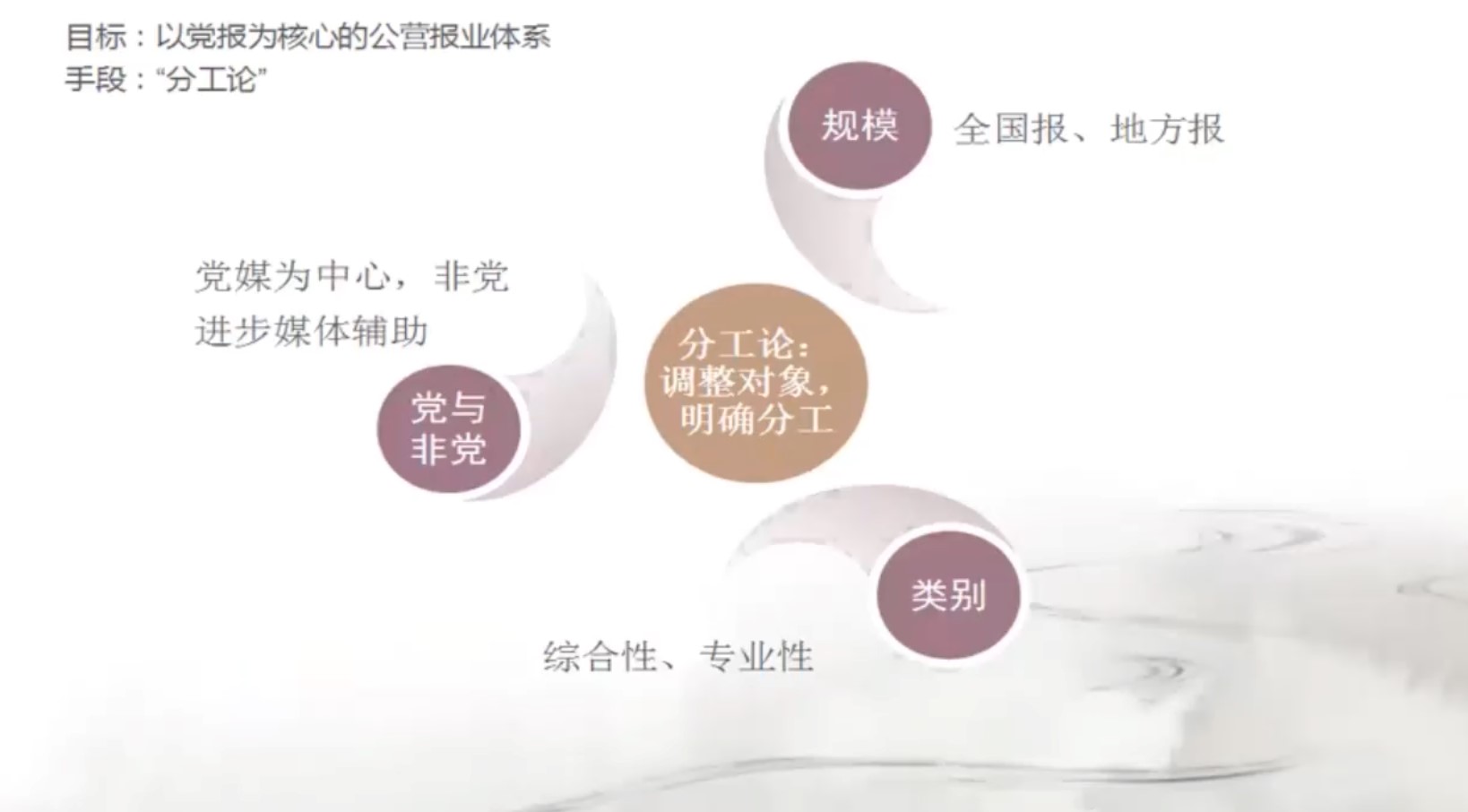 建国初期,报业的改革和工作原则可简单概括为十六字:整编机构、明确分工、改进工作、合理经营。各报要坚持党的领导,完成经济脱困与转型,坚持思想改造,明确工人阶级的领导思想;完成身份转变,从私营报成为人民报纸,实现公私合营与组织机构的调整。在报业的组织建制上,私营报纸中基层党组织初步组建,而私营报纸则在新民主主义的旗帜下未经中国共产党的直接插手干预,而是主要采用以“私人关系”的方式派遣进步分子进入并推动具体工作。