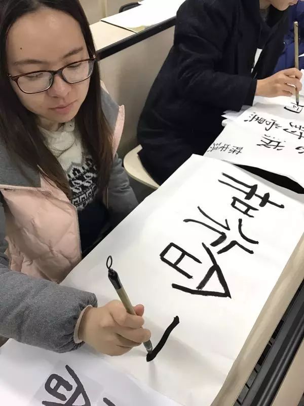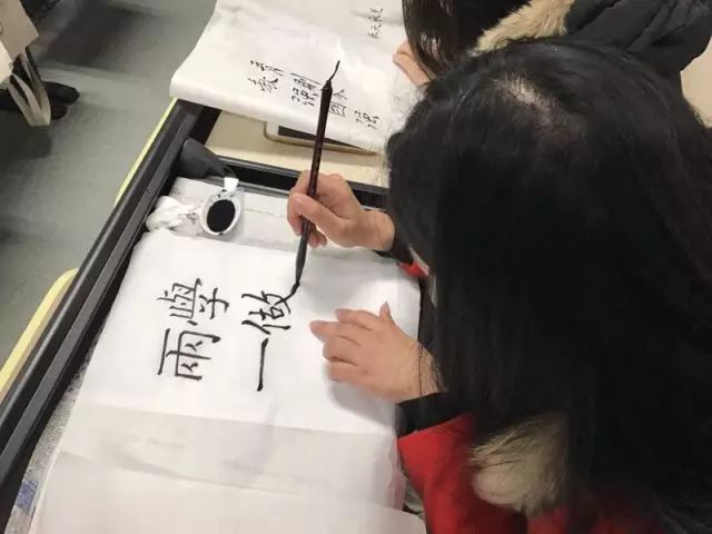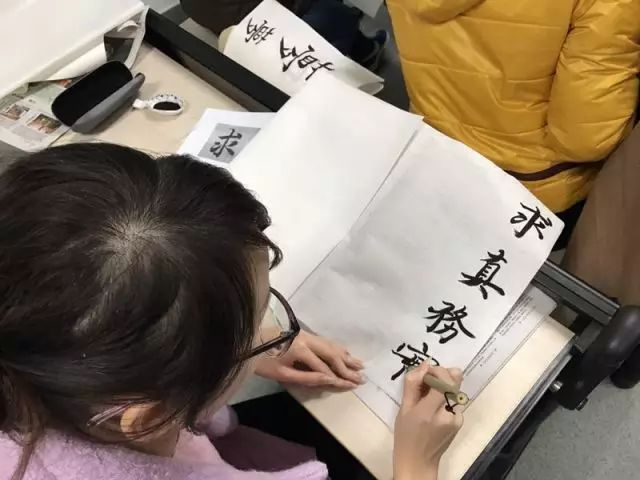 大家正在一笔一划地书写着自己的作品。小伙伴们认真书写的模样确实可爱呢!活动之后同学们都带走了自己亲自书写的墨宝留作纪念。