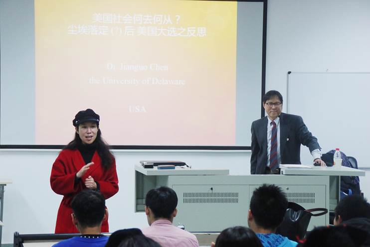 2016年12月15日下午,应公司邀请,美国特拉华大学孔子公司经理陈建国教授莅临yl23411永利集团,做了题为“美国社会何去何从?——尘埃落定后美国大选之反思”的精彩讲座,并与师生进行了交流对话,本次讲座由公司陈虹教授主持。