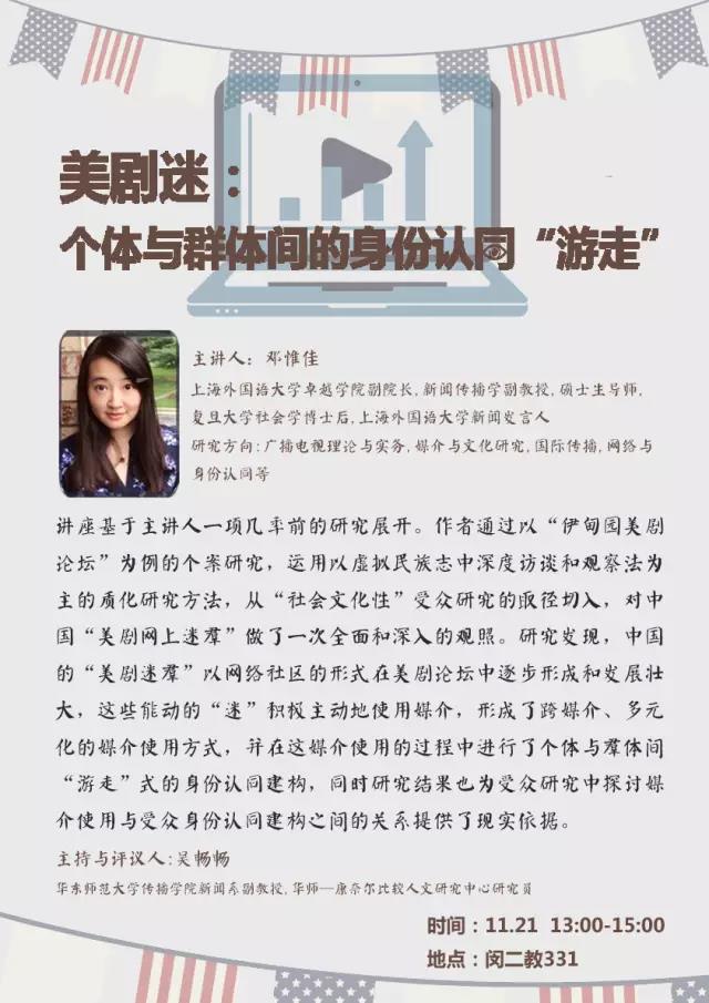 讲座基于主讲人一项几年前的研究展开。作者通过以“伊甸园美剧论坛”为例的个案研究,运用以虚拟民族志中深度访谈和观察法为主的质化研究方法,从“社会文化性”受众研究的取径切入,对中国“美剧网上迷群”做了一次全面和深入的观照。