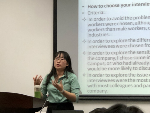 夏冰清老师以质化研究方法中常见的“深度访谈”方法为例进行了阐述。她指出,深度访谈依据访谈提纲的结构形式主要有闭合式、半开放式和开放式三种,一般情况下后两种方式比较常用,而访谈提纲是对研究问题的细化和深化过程,同时它也是基于研究者对研究问题、研究对象和前期研究文献基础的理解的反馈。即使是在开放式深度访谈中,也应事先准备好一份访谈提纲,提纲中的问题不必具体而微,但要有大致指向,研究者才不会在访谈中迷失方向。在访谈对象的选择上,研究者同样需要考虑样本的代表性、取样方法的科学性和样本质量的多样性等问题。她认为,质化研究是以“基于衡量样本的特殊性的代表性问题”作为一种选取标准,因此在这个意义上的“代表性”,也要排除对样本对研究问题是干扰因素,诸如避免性别偏见,考虑年龄因素,选择主体呈现积极者以及保证异质性对象等。当我们在涉及到敏感话题时,也要尽量避免给研究对象造成伤害。另外,夏老师结自身经验为我们提供了如从日常话题开始访谈而不是直奔研究主题、在适当的时候表现地“无知”些,来激发访谈对象的倾诉欲、不断地去问“举个例子?”和“为什么?”等十二条非常实用的建议。