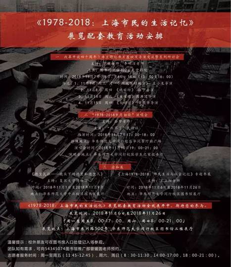 此项活动将与社会发展公司民俗学研究办承办的《上海1978-2018:市民生活与社会记忆》展览相配合,引导师生和社会公众,透过上海四十年发展这一经典个案,认识国情,理解开放,更深切得体会改革开放对于中国发展的历史性意义。