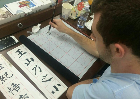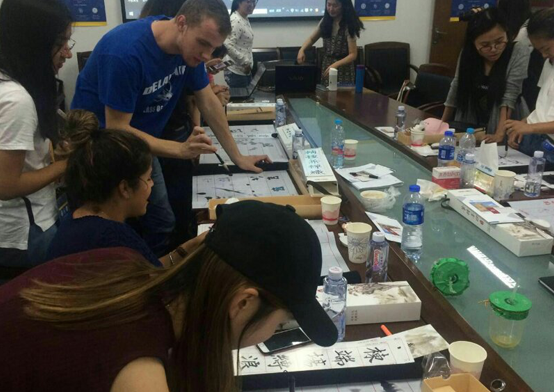 (中美老员工在书法活动中学写毛笔字)