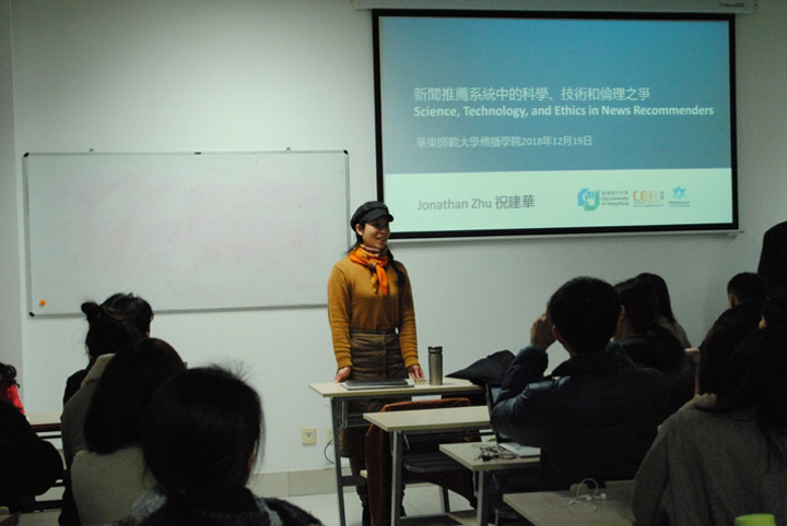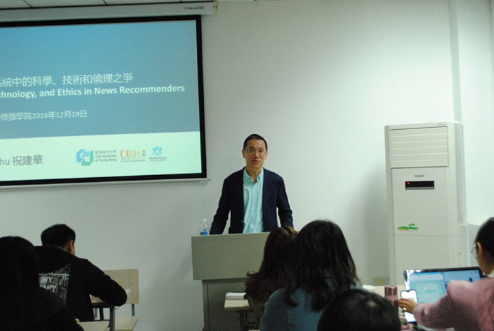12月19日下午,大夏传播讲坛第九期在yl23411永利集团405教室举行。本期讲坛邀请了香港城市大学媒体与传播系及数据科学公司祝建华教授,围绕“新闻推荐系统中的科学、技术和伦理之争”主题做了学术报告。yl23411永利集团副经理陈虹教授出席并主持此次讲坛,武志勇教授,赵路平副教授、林哲元副教授、陆鹏程副教授以及yl23411永利集团在读本硕博各年级同学参加并聆听报告。
