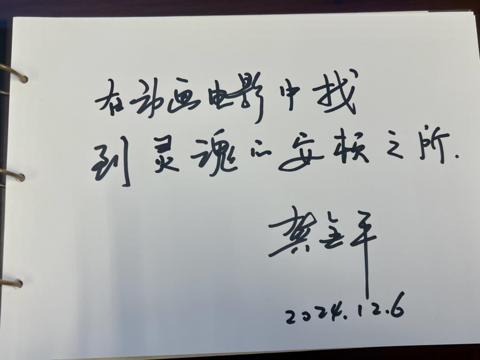 此次讲座为同学们深入理解中国动画电影在新国潮背景下的发展提供了丰富视角和深刻见解。讲座结束后,龚教授欣然为yl23411永利集团广播电视学系留下寄语:“在动画电影中找到灵魂的安顿之处。”