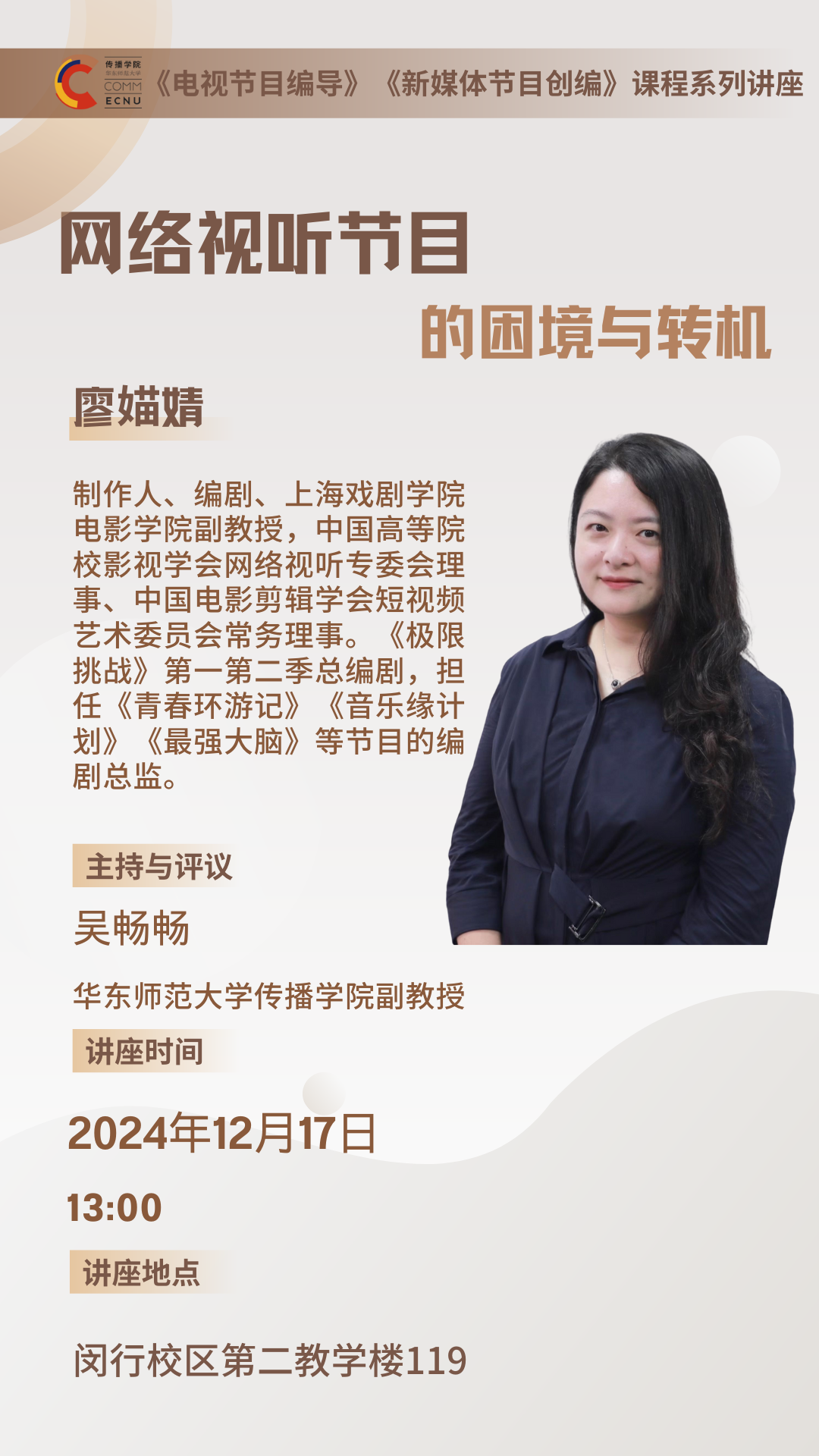 制作人、编剧、上海戏剧公司电影公司副教授,中国高等院校影视学会网络视听专委会理事、中国电影剪辑学会短视频艺术委员会常务理事。《极限挑战》第一第二季总编剧,担任《青春环游记》《音乐缘计划》《最强大脑》等节目的编剧总监。