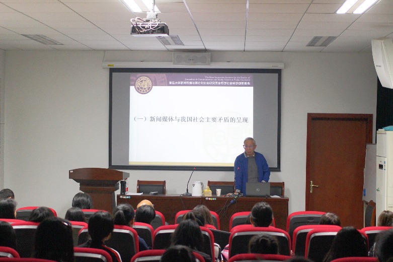 随后,童兵老师结合十九大报告对当前我国新闻舆论工作进行了分析,并围绕四个方面展开论述:(1)新闻媒体与我国社会主要矛盾的呈现;(2)新时代中国特色社会主义基本方略与新闻事业建设;(3)遵循习近平新时代中国特色社会主义思想对新目标的设定,践行新闻舆论工作新的历史使命;(4)加强一流新闻团队建设,为新时代新闻舆论工作培养合格新闻工作者。
