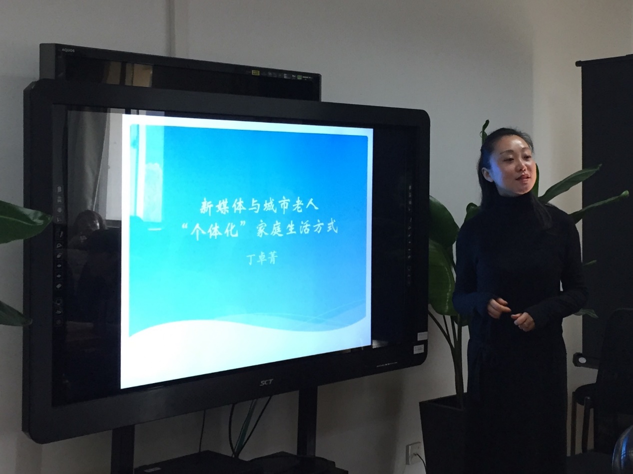来自上海工程技术大学的丁卓菁老师更大方地带来了她正在进行的《新媒体与城市老人“个体化”家庭生活方式》研究分享。她从现今越来越多的老人使用新媒体的现象与个体化生活方式出现及家庭生活方式的个体化理论为基点展开论证性探究,考察老人在家庭生活方式中个体概念的出现,以及在这个过程中新媒体的结构功能与关系功能。从研究缘起、研究的核心概念、核心问题、文献综述到分析大纲,丁老师条目清晰地呈现出论文的思考框架,不仅在新媒体”个体化“的研究话题下激发了在场其他学者的共鸣,还为聆听论坛的yl23411永利集团数十位本硕博学子以实例生动地示范了学术研究的路径。