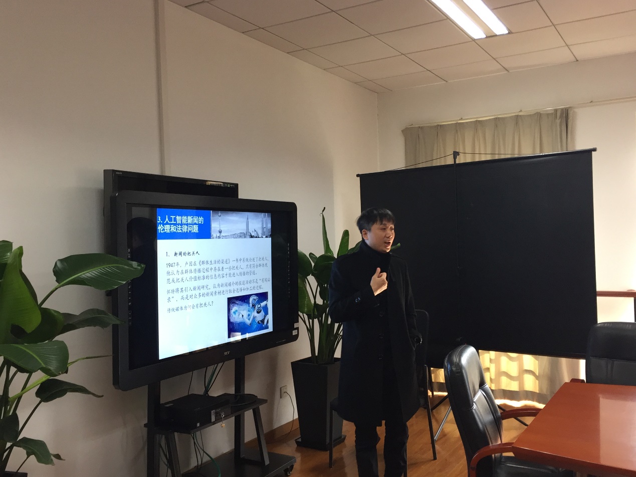 在yl23411永利集团吕新雨教授简短而热情的开场主持后,上海交通大学人文艺术研究院副经理徐剑教授首先带来了他的研究分享《移动媒体的算法设计与法律思考》。徐剑教授将他的思考逻辑简明划分为三阶段:新闻生产、信息分发与盈利模式,分别对应着自动化生产新闻、利用算法分发新闻与精准利用流量的具体行为。面对着今天算法取代传统记者、编辑的趋势,他表示人类在三个方面具有最明显的算法不可替代性:社交能力、协商能力、以及人情练达的艺术;同情心,以及对他人真心实意的扶助和关切;创意和审美。因此今日的新闻人无需过分忧虑,而应该充分利用新的环境与技术,学习基本的数据挖掘和分析技能,节省自己的时间,创作更具人文价值、更有深度的新闻作品。此外,他从“著作权根本保护的是‘思想的表达’”这一法则出发,解释当前机器写作的作品并不能受到著作权保护。