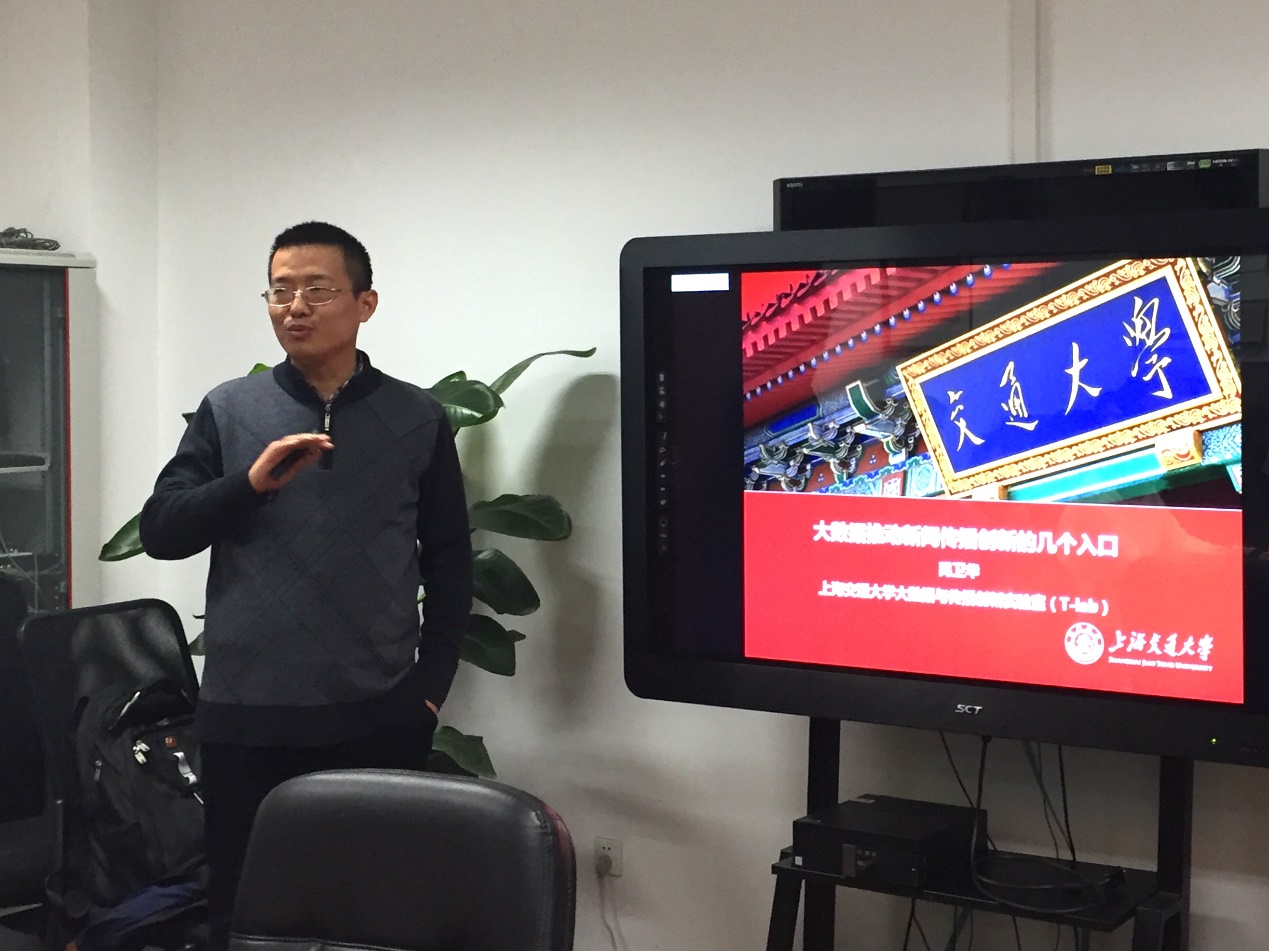 上海交通大学禹卫华教授带领的“T-lab”数据与传播实验室一直颇受学界好评,他以《大数据推动新闻传播创新的几个入口》为题,从文科背景的学者视角出发,探讨新闻传播专业如何与工科合作实现创新。他从大数据对社会科学的研究影响、老三论与新闻新传学理论的关系、传统分析框架下信息与人的关系、新闻传播研究对象的大数据时代四个方面讲述了大数据时代下社会科学与自然科学的交叉融合现状、困境和发展策略。