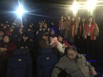 下午1时许,观众纷纷来到海上明珠影城。公司七位同学同解说员、影院工作人员一起,帮助残障人士到达指定场次,静候电影开场。