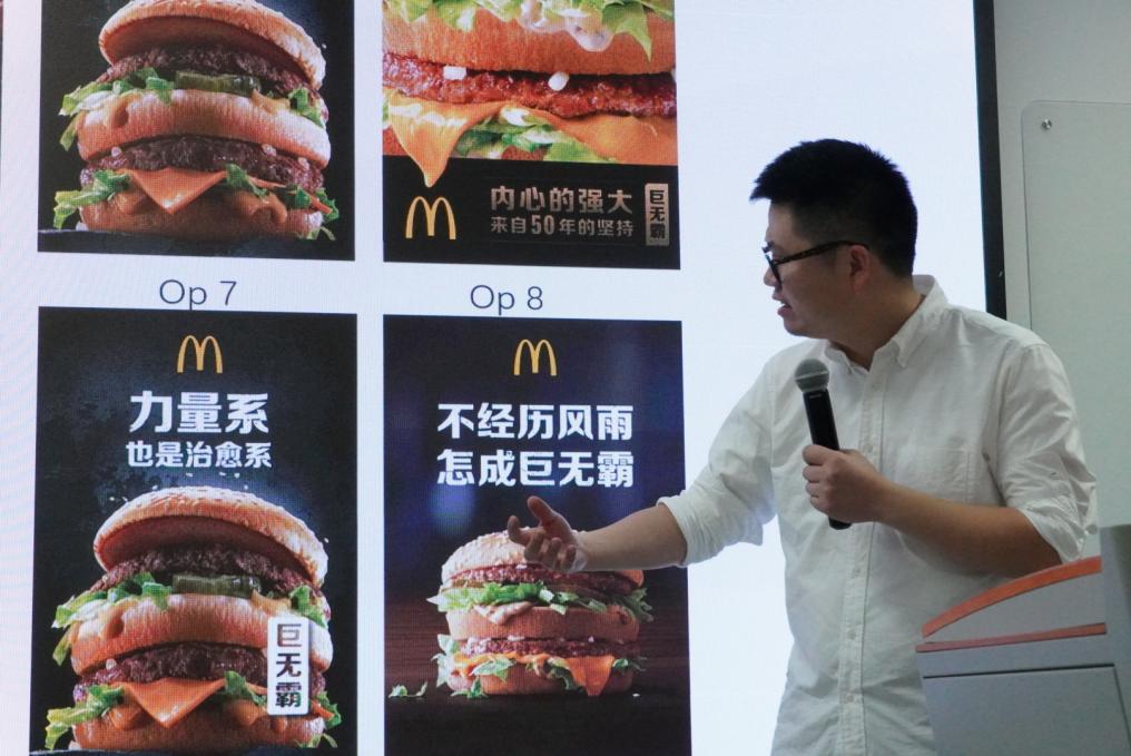 第一个案例来自疫情初期,吴维鸿及其团队需要帮助麦当劳解决“在消费者无法外出到店就餐的情况下,怎样做好营销策略”的问题。通过展示一套完整的提案,吴总向同学们分享了自己与团队如何围绕“代表麦当劳精神的巨无霸”这一命题发挥创意、提炼文案,用“不经历风雨怎成巨无霸”、“终有一种力量你可以相信”以及“我在”这些巨无霸汉堡拟人化的安慰口吻,表达麦当劳想要向特殊时期的社会发出的声音,最终在居民楼电梯广告与微信的条漫推送落地投放的一系列过程。结合该案例,吴总强调,在文案创作中,学会把有距离感的文字变成符合策略需要和消费者需求的灵动语言,对于营销的成功与否至关重要。