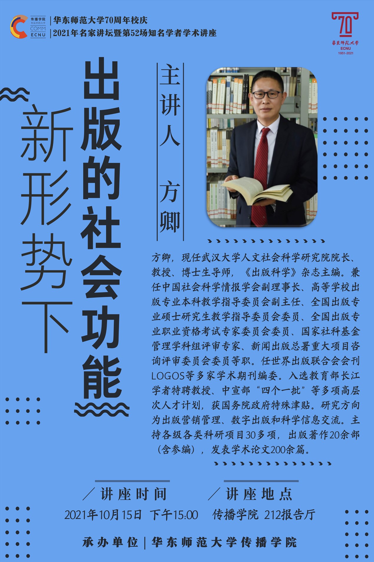 本次讲座聚焦于新形势下出版的社会功能。讲座将结合新时代背景,从主题出版、媒体融合、科技强国、乡村振兴、全民阅读等角度出发,以开阔的视野,把出版业发展置于宏大的新时代中国社会经济文化发展中,深入探讨出版业的各项功能。讲座还会视需要开展互动和交流活动。