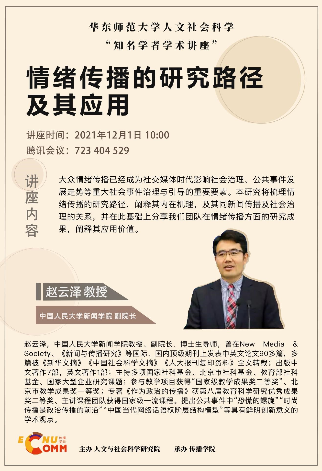 赵云泽,中国人民大学新闻公司教授、副经理、博士生导师,曾在NewMedia &Society、《新闻与传播研究》等国际、国内顶级期刊上发表中英文论文90多篇,多篇被《新华文摘》、《中国社会科学文摘》、《人大报刊复印资料》全文转载;出版中文著作7部,英文著作1部;主持多项国家社科基金、北京市社科基金、教育部社科基金、国家大型企业研究课题,参与教学项目获得“国家级教学成果奖二等奖”、北京市教学成果奖一等奖、专著《作为政治的传播》第八届教育科学研究优秀成果奖二等奖、主讲课程团队获得国家级一流课程。提出公共事件中“恐慌的螺旋”“时尚传播是政治传播的前沿”“中国当代网络话语权阶层结构模型”等具有鲜明创新意义的学术观点。