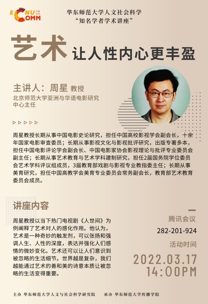 周星教授长期从事中国电影史论研究,担任中国高校影视学会副会长、十余年国家电影审查委员;长期从事影视文化与影视批评研究,出版专著多本,担任中国电影评论学会副会长、中国电影家协会影视理论与批评专业委员会副主任;长期从事艺术教育与艺术学科建制研究,担任2届国务院学位委员会艺术学科评议组成员、3届教育部戏剧与影视专业教指委主任;长期从事美育研究,担任中国高教学会美育专业委员会常务副会长、教育部艺术教育委员会成员。