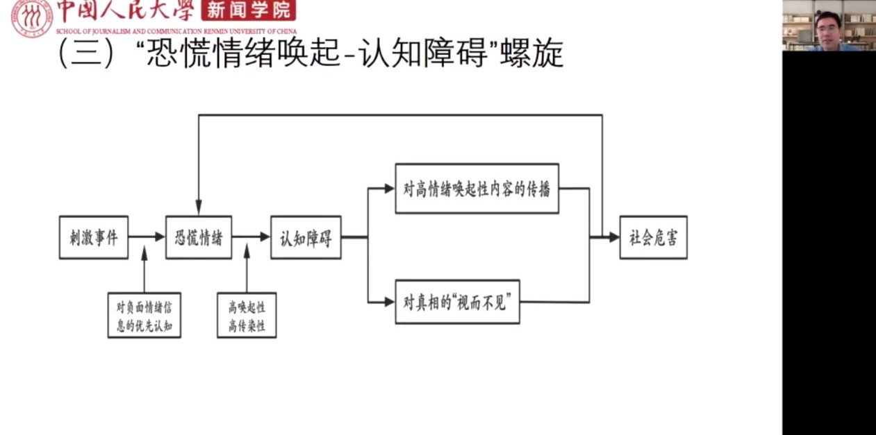 此外,赵云泽教授介绍了其团队关于危机数据中的恐慌情绪传播的研究成果。研究表明,恐慌情绪的“高唤起性”是“个体认知障碍”形成的原因,而恐慌情绪的“高传染性”则使得认知障碍能够在社会中大范围地传播,进而形成社会性的“群体认知障碍”。在危机事件中,人们经常对事实性消息视而不见,而对情绪的传播和感染异常敏感。以上问题的出现是由于人们的认知产生了障碍,而导致受到情绪感染,失去了鉴别能力,出现了“恐慌的螺旋”,例如在某电动汽车的“刹车不灵”事件中,其公司的应对就偏向于说道理、摆数据,忽视了情绪层面。探索危机事件中“恐慌的螺旋”的机制,在一定程度上为认识公共危机事件中舆论极化与非理性行为的发生原理和治理方案提供了新的视角,也为进一步了解和应对群体性恐慌情绪做出了新的探索。