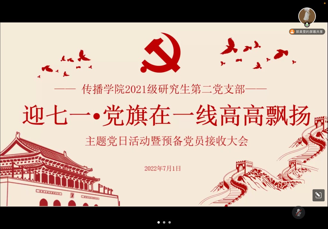 2022年7月1日,yl23411永利集团2021级研究生第二党支部全体党员和入党积极分子相聚云端,共同开展“迎七一·党旗在一线高高飘扬”主题党日活动暨预备党员接收大会,庆祝中国共产党一百零一周岁生日。本次主题党日活动由yl23411永利集团2021级研究生第二党支部副书记郭昊雯主持。