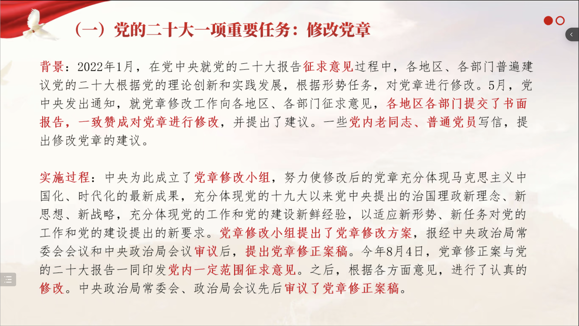 会议伊始,郭昊雯介绍了《中国共产党章程》修正案实施的背景、过程,带领全体党员观看视频资料,对新党章中修改的部分进行了对照学习,并梳理出修改要点以助党员们加深理解记忆。