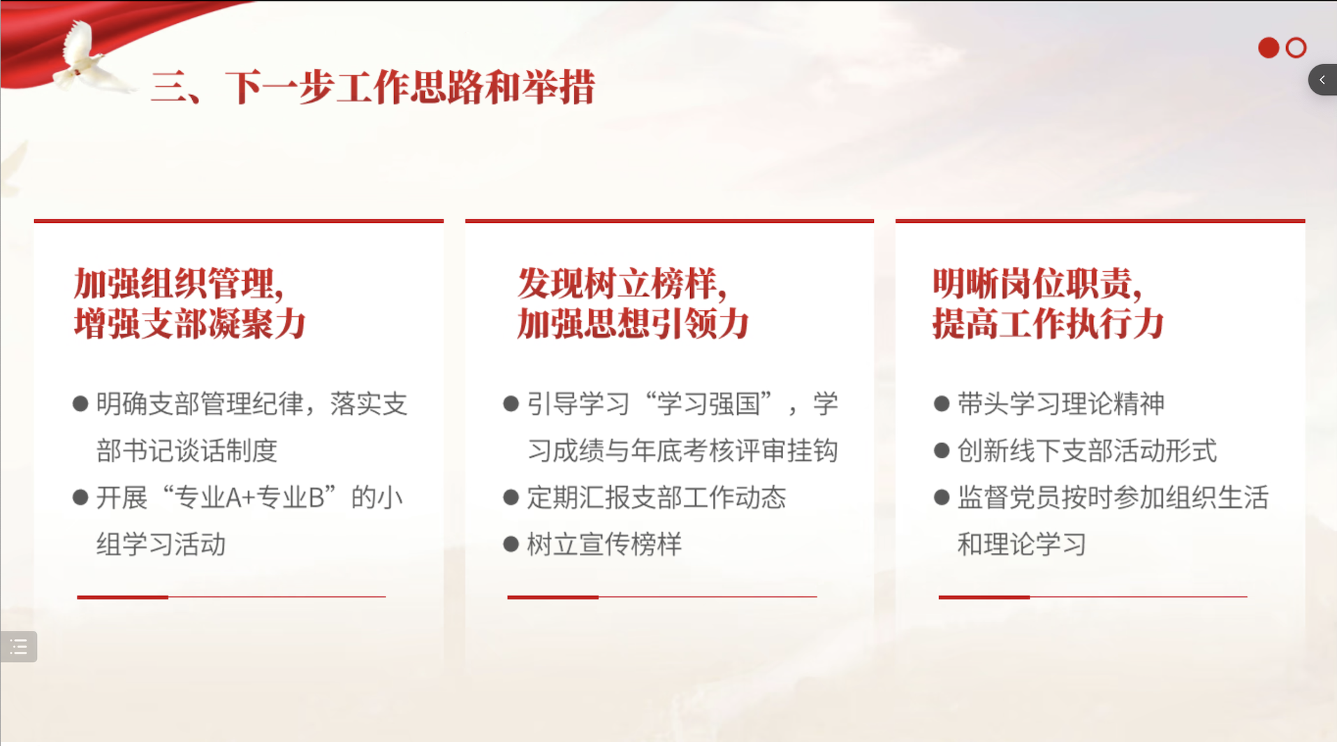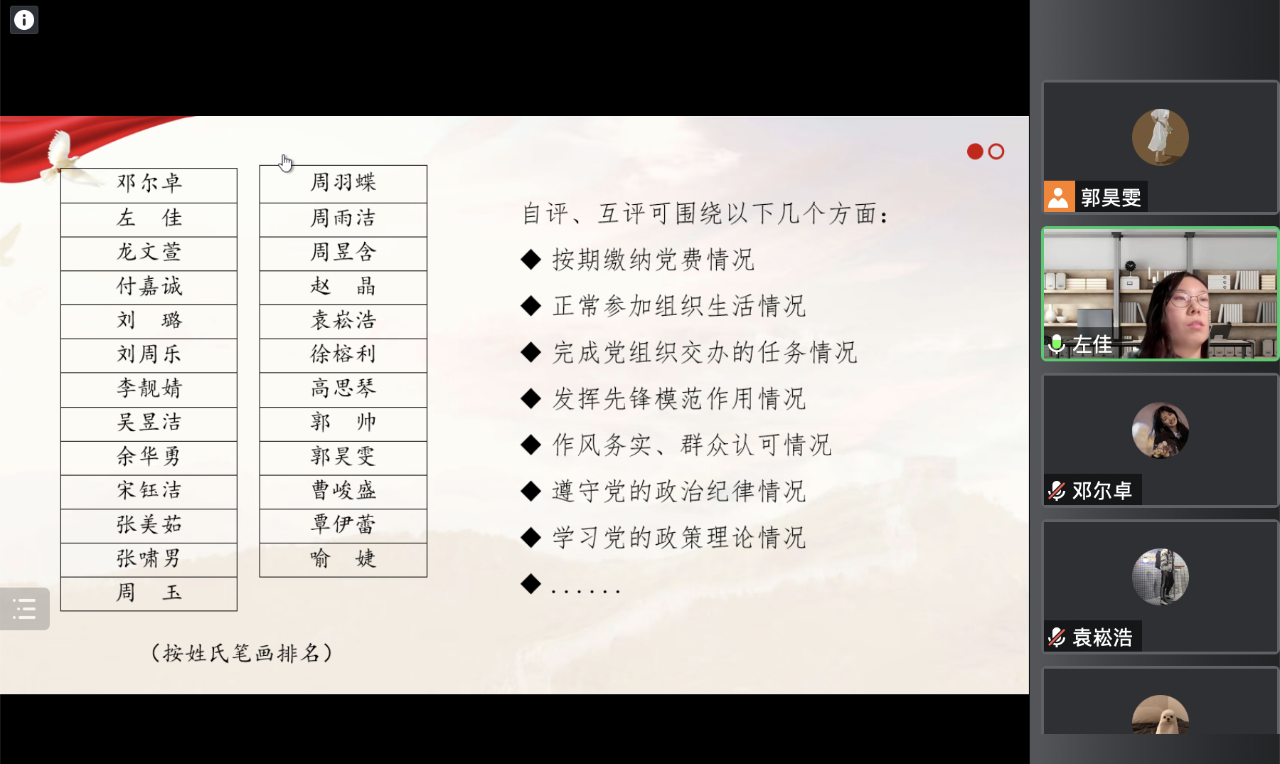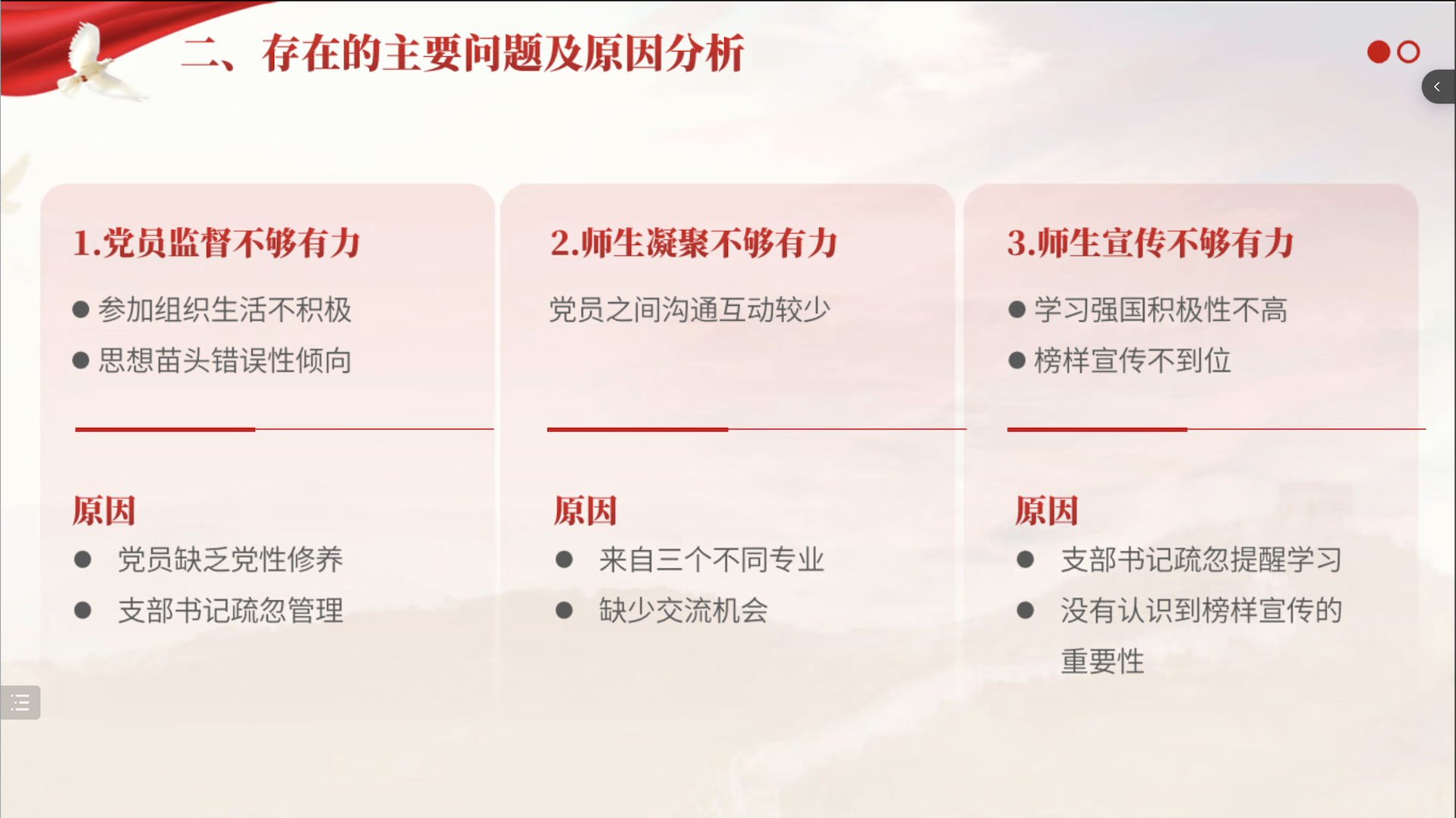 随后,郭昊雯从支部工作情况与开展成效、目前存在的问题及原因、下一步的工作思路和举措共三个方面回顾了一学年以来的工作情况,并指出加强组织管理、发现树立榜样、提高工作执行力等工作方向。