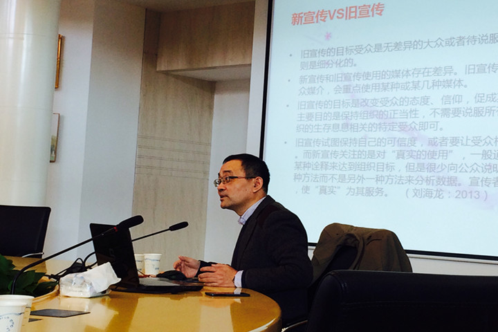 张涛甫教授试图通过社会认同及机制来帮助在场师生理解社会结构与共识心态之间的关系架构。他认为,人类个体出生于一定的社会结构中,由于出生地点、肤色、家世和生理机能等的不同,他们落入某些范畴而不是另一些范畴。他们内化了居支配地位的价值观,认同这些外界划定的范畴,进而获得了一些独特的社会认同。社会认同路径通过引入自我范畴,而将个体与群体归属或社会认同联系起来。所有认同都在一套社会关系体系内建构起来,并要求与其他认同相互认知,不应把认同看作个“事物”,而应看作“关系与表述的体系”。塑造集体认同是一个微妙的过程,要求不断投入,当集体认同到了类似制度化的社会行为的程度时,它会形成组织形式、一套规则、领导模式。对于制度化程度较弱的行为,其特征更类似那种必须不断作用才有可能实现的行为过程。同时,张涛甫教授也对舆论宣传、社会认同与意识形态之间的关联机制进行了阐述,为新宣传理念的提出进行了理论铺垫。