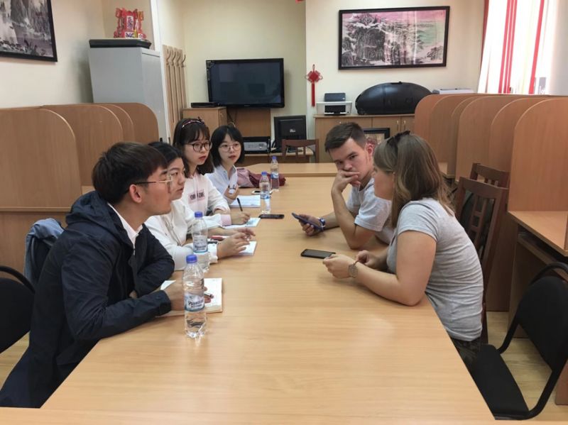在喀山大学东方系,同学们就马克思主义在当今俄罗斯的研究现状、喀山年轻人的文化认同这两个主题分别采访了哲学系教授Shakirov Alfred和两名东方系的员工。有了之前的经验,加上随队记者、老师的指导,同学们逐渐进入状态,顺利完成了下午的采访任务。
