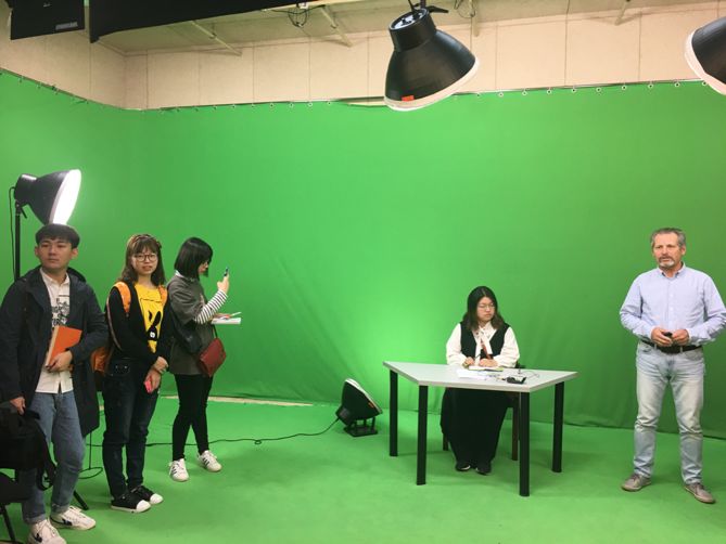8月23日,实践团队来到喀山大学新闻系进行交流访问。新闻系副主任Karimov Ildar首先介绍了喀山大学新闻系的基本情况,并特别提到该系最大特色是强调理论学习与实践的紧密结合,拥有全俄唯一的大学创办的公共电视台——Univer TV,新闻系员工从入学起便可在其中参与制作媒体作品,优秀员工还可拥有毕业后直接进入电视台工作的机会。在新媒体中心主任Dautova Reseda的陪同下,师生实地考察了Univer TV的虚拟演播室和脱口秀录制厅。