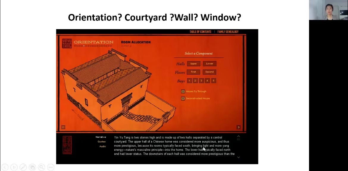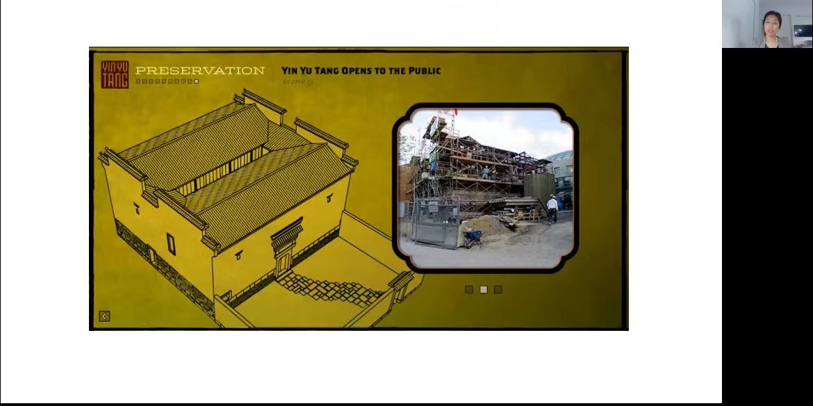在讲座的最后一部分,韩莉老师对建筑在媒体中如何被运用进行了分析。韩莉老师通过一段关于荫余堂的纪录片(该纪录片的讲述者有在塞勒姆当地的美籍华人和博物馆负责人,其内容是讲述荫余堂这样一栋房子如同一个时间胶囊,其中来自各个时代的物什,让观看者在短短十几分钟内,通过一个中国家庭看到中国一两百年历史、社会和家庭的变迁),来说明个体和机构对于该民居的移植和展示的意义的理解与阐述。