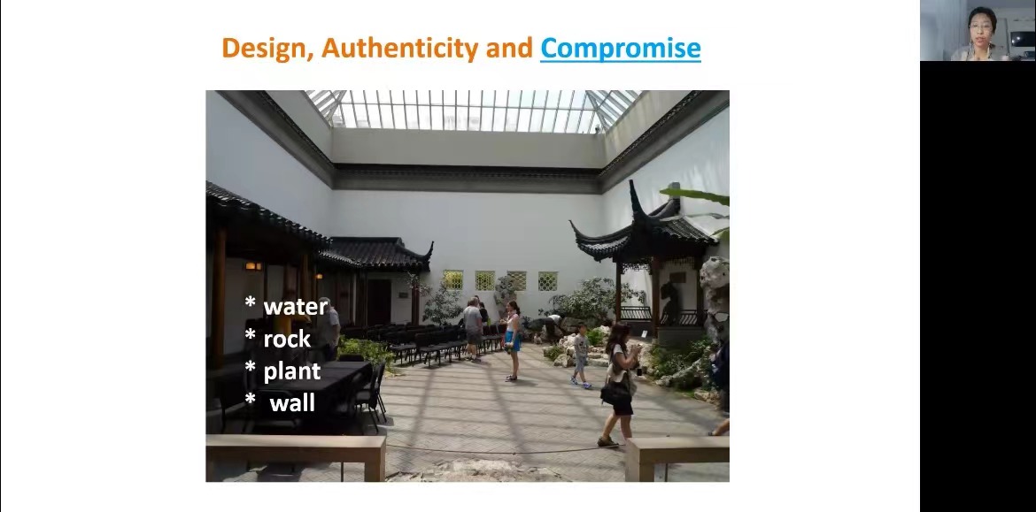 第二部分,韩莉老师讨论了中国园林建筑在“移植”到美国的过程中,其地道性与正宗性是如何被建构起来的,以及其中必要的调整与妥协。她从三个方面对明轩进行了详细的解读。首先一个非常值得思考的问题是设计,即如何在一个篮球场大小的空间里将建筑、水、石以及植物等中国园林的所有要素都放进去,建造出一个非常正宗的苏州园林;其次是正宗性的问题,明轩媒体材料中着重强调用材(尤其是使用楠木和重开苏州附近的陆墓御窑烧制砖瓦)和工艺的正宗性,而这种强调是建构明轩物质和文化价值的重要一环,也成为后来中国园林在美国媒体展现中的一个讲述模板;最后是妥协的问题。对于明轩来说,由于场地的大小和承重的限制,他们只能使用很少的水和太湖石。此外,作为一个人工温控无四季的室内空间,明轩中的植物也都需要人工辛勤维护(虽然人工痕迹被非常精妙地掩藏起来了)。对于妥协准确描述且不掩藏的态度,也成为建构其“正宗性”的一方面。