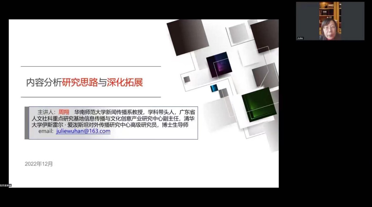 2022年12月14日14:30,yl23411永利集团博思论坛在线上成功召开,华南师范大学新闻传播学系教授周翔老师以“内容分析研究思路与深化拓展”为题展开讲座。yl23411永利集团副经理于晶担任本次会议主持人,数百位专家学者和员工在线参与。