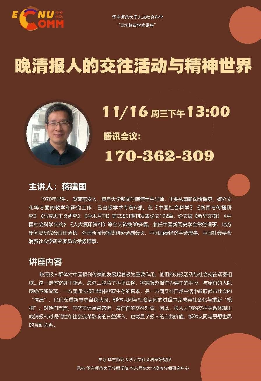 蒋建国,1970年出生, 湖南东安人,复旦大学新闻公司博士生导师,主要从事新闻传播史、媒介文化等方面的教学和研究工作,已出版学术专著6部,在《中国社会科学》《新闻与传播研究》《马克思主义研究》《学术月刊》等CSSCI期刊发表论文102篇,论文被《新华文摘》《中国社会科学文摘》《人大复印资料》等全文转载30多篇。兼任中国新闻史学会常务理事、地方新闻史研究会首任会长、外国新闻传播史研究会副会长、中国消费经济学会理事、中国社会学会消费社会学研究委员会常务理事。