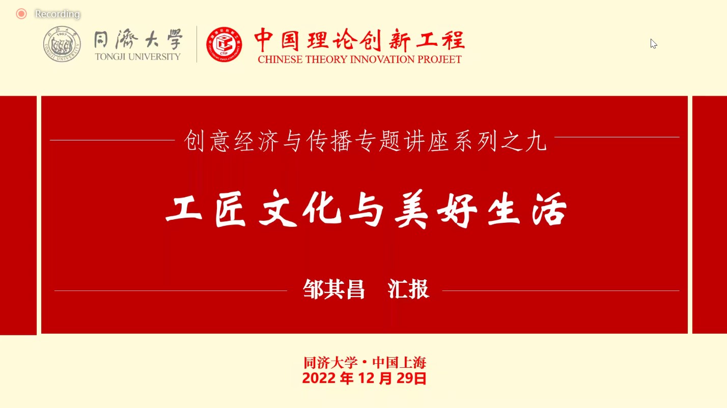 12月29日下午,2022年秋季学期“创意经济与传播讲座系列”的第九场讲座正式开讲,主讲人为同济大学设计创意公司和上海国际设计创新公司双聘教授邹其昌先生。本次讲座中,邹其昌先生从人力资本、社会资本等多方面展开,对工匠文化和设计学科的当下与未来进行了探讨并给出了可行的建议,同时对于自己多年来的设计学研究成果进行了综述,数十名学子在线上聆听。