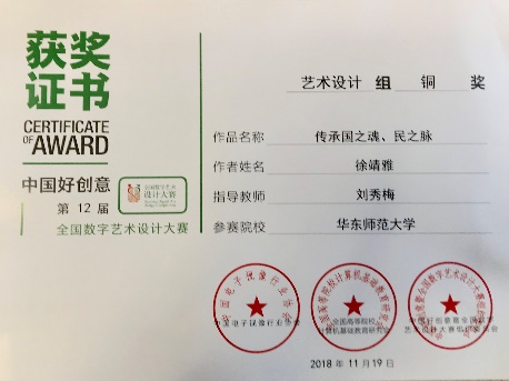 在此次大赛评审专家中,公司yl23411永利集团广播电视专业学科带头人刘秀梅教授、博士生导师,担任数字艺术设计专家委员会高级专家、中国高校科学与艺术创意联盟常务理事和全国数字艺术设计大赛评审专家。大赛设有产品设计组、视传设计组、艺术设计组、环艺设计组、视频拍摄组、数字动画组、数媒交互组、数字摄影组、艺术创意组和包装设计组。此次大赛投稿作品多达三万余件,其中公司yl23411永利集团广播电视专业硕士数字媒体艺术方向的16级研究生王竹青同学以《环中生还》作品荣获本次大赛视频拍摄组金奖,18级研究生徐靖雅同学以《传承之魂民之脉》荣获艺术设计组铜奖,17级研究生王旻乾、张硕衍同学以《I’m Sara》荣获视频拍摄组优秀奖。