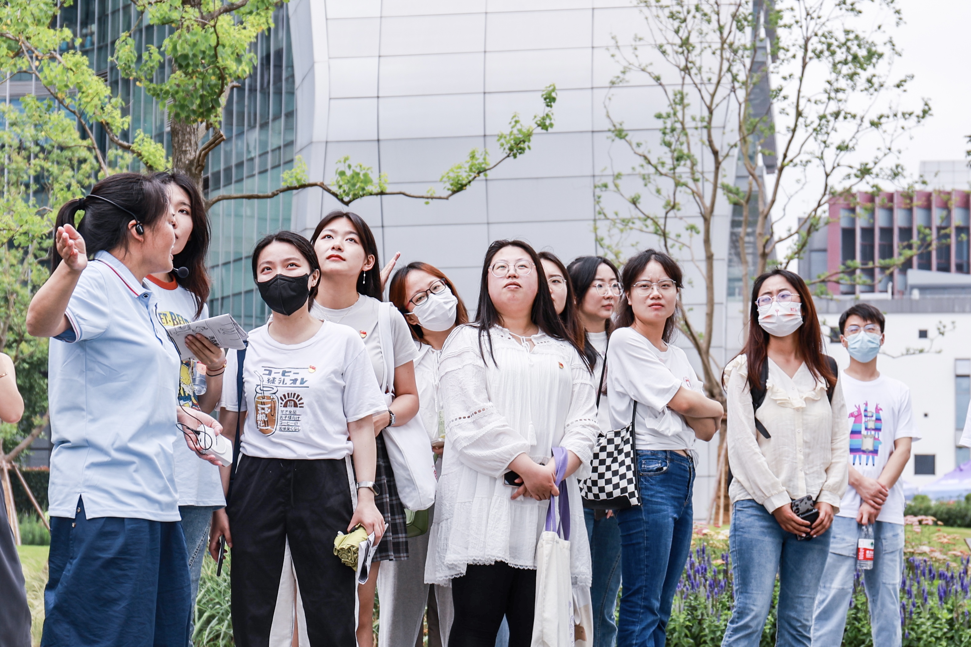 一路行至1915年英商怡和纱厂旧址,见一处低洼低地便是雨水花园,其周边栽种着各式各样的水生植物,用于就地消纳雨水、调节微气候,是一种生态可持续的雨洪控制与雨水利用设施。在讲解员的带领下,党员们还学习了雨水花园所融合的“海绵城市建设”概念以及“东方渔人码头”的设计理念,进一步了解杨浦滨江“还江于民”所作的努力。