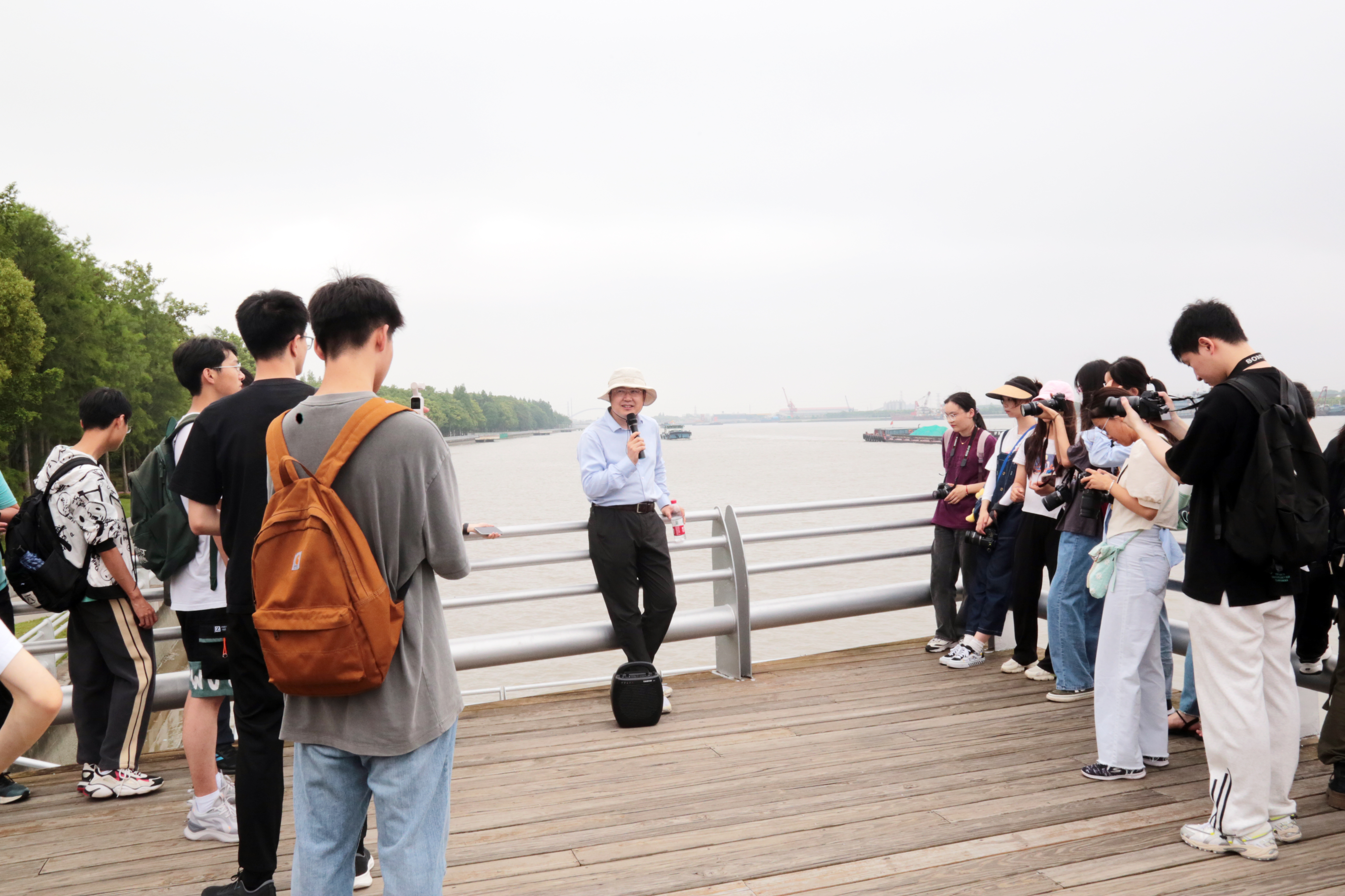 师生调研团队首先来到紫竹滨江公园的亲水平台。漫步江边步道,沿途人文、科技、生态元素交相辉映,江面上货船来来往往,“浦江第一湾”江边景观一览无余。