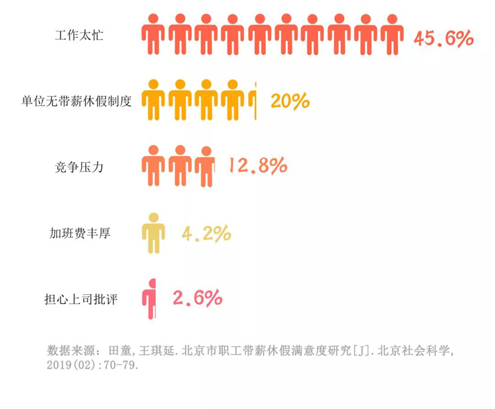 2017年中国人民大学进行了一项国家休假制度改革调查,以北京城六区 (西城区、东城区、海淀区、朝阳区、丰台区、石景山区) 15岁以上的常住居民为调查对象。结果显示职工无法享受带薪休假的原因主要是“工作太忙”和“单位无该制度”。