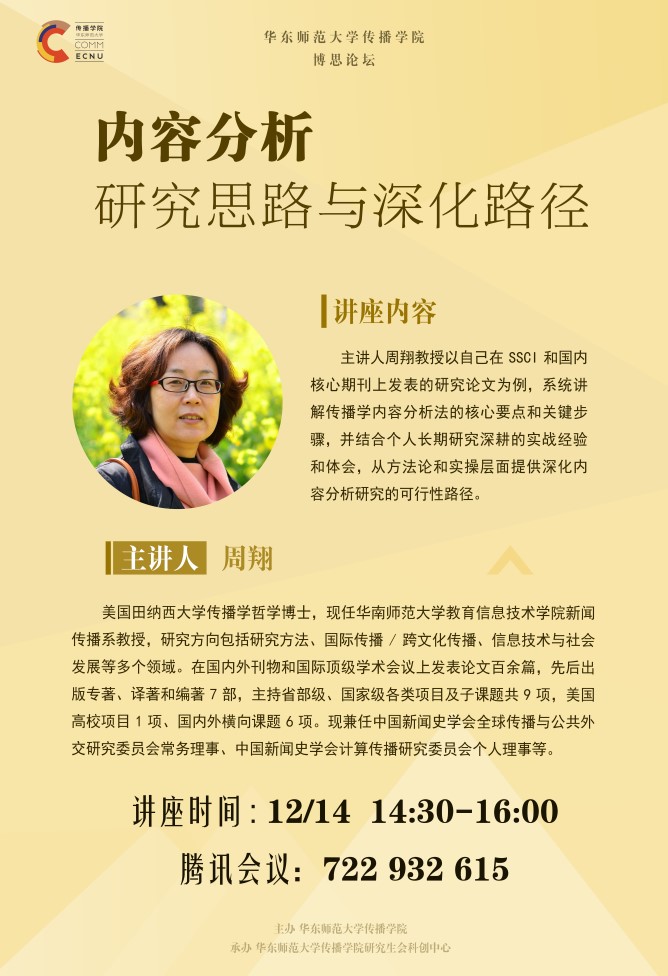 本讲座将以主讲人在SSCI和国内核心期刊上发表的研究论文为例,系统讲解传播学内容分析法的核心要点和关键步骤,并结合个人长期研究深耕的实战经验和体会,从方法论和实操层面提供深化内容分析研究的可行性路径。