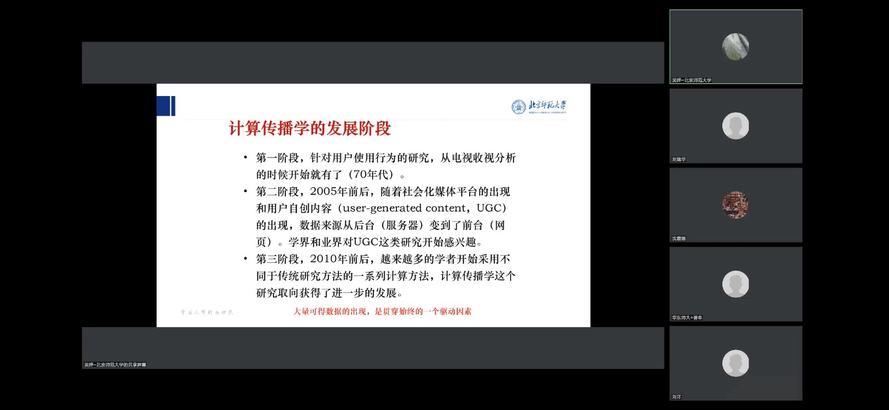 此次讲座吴晔老师主要从“计算传播学”的角度出发,结合北京师范大学计算传播学研究中心的若干研究实例,着重进行了三方面的论述,即计算传播学的起源、与传统量化研究的异同以及计算传播学的研究思路。