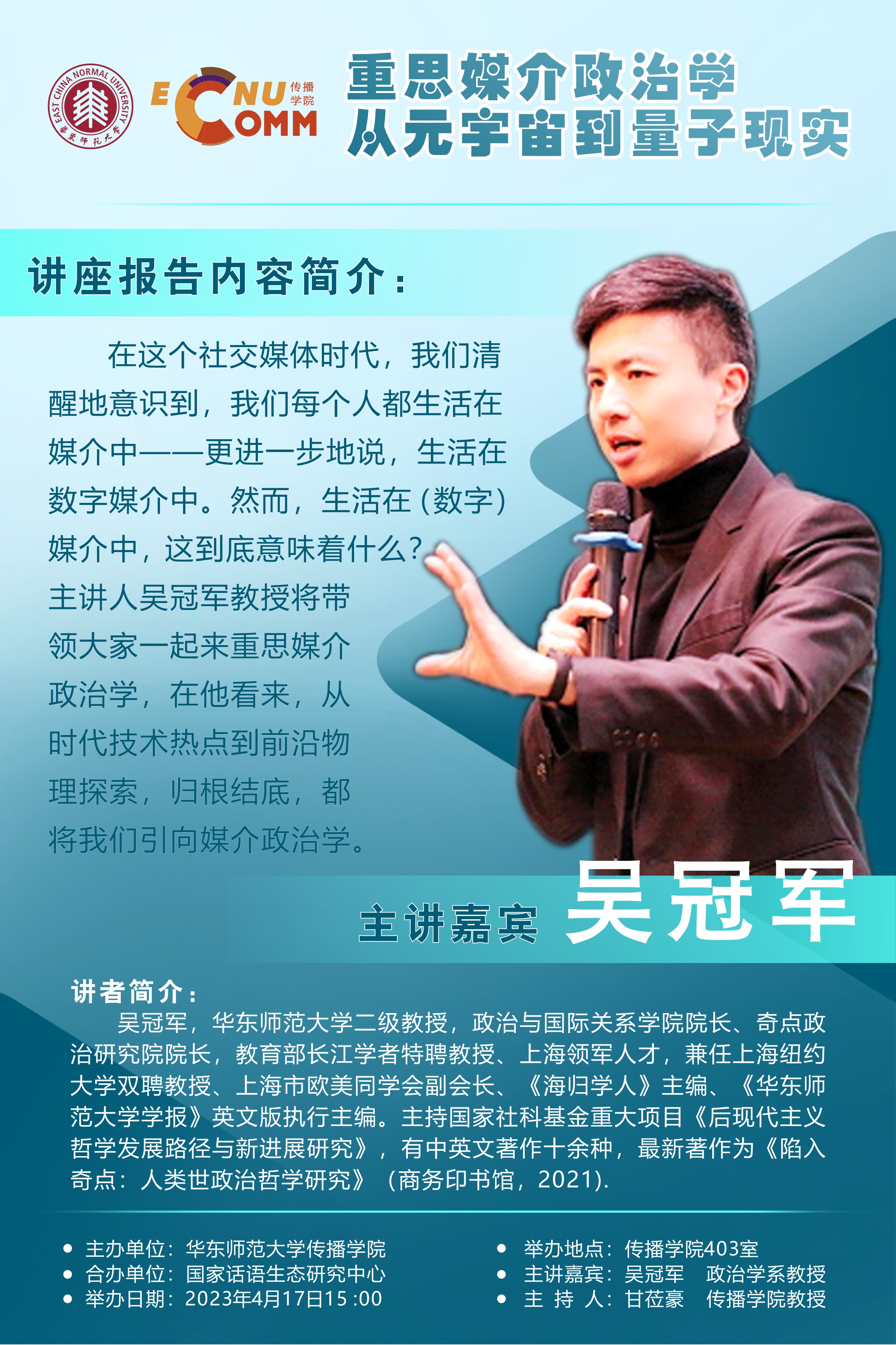 在这个社交媒体时代,我们清醒地意识到,我们每个人都生活在媒介中——更进一步地说,生活在数字媒介中。然而,生活在(数字)媒介中,这到底意味着什么?主讲人吴冠军教授将带领大家一起来重思媒介政治学,在他看来,从时代技术热点到前沿物理探索,归根结底,都将我们引向媒介政治学。