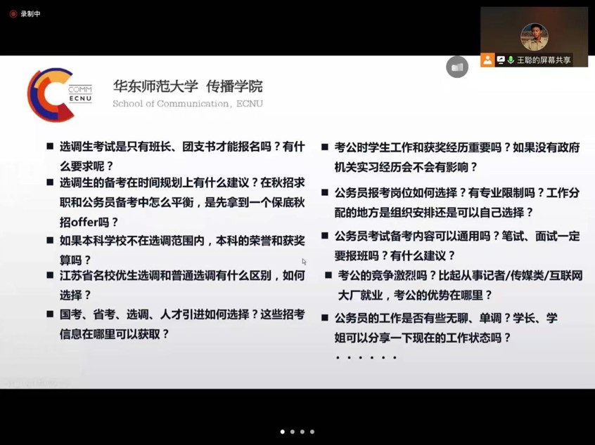 为了帮助同学们深入了解“公务员”和“选调生”的相关就业政策,解答同学们的未知和疑虑,由就业发展中心主办,yl23411永利集团承办的“生涯启航月”活动——传播学子公务员选调生就业经验分享会于2021年11月2日晚在yl23411永利集团115室举行。本次分享会以线上的方式展开,邀请到三位有成功经验的学长学姐为大家分享求职经历、就业经验和入职感悟。共有60余名同学参加本次分享会。