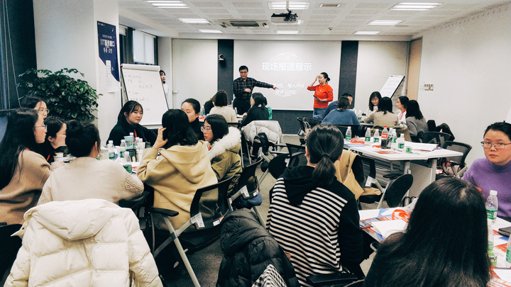下午场的培训是中国传媒大学播音主持艺术公司副教授宋晓阳给大家做的“新闻现场人格化表达”课程。宋晓阳副教授分析了诸多现场报道,教大家在坚守新闻专业操守的基础上对新闻现场进行信息抓取,这些信息既包括动态信息、现场实物,也包括现场细节和画面呈现。宋副教授给大家阐述了自己对于2019年短视频新闻的发展趋势即记者将重返现场。那么,在这样的大背景下,掌握移动端传播互动性的语言策略就至关重要。于是,宋晓阳副教授就给大家亲自展示每一个口语修辞策略。培训之后,宋副教授布置了一个任务让大家选取了三个场景来考察大家的现场报道能力。华师大同学组选取了当天活动的流程进行了四分半的虚拟现场报道。结束之后,宋老师给出鼓励性意见,总结下来就是“厚着脸皮多联系,注意逻辑分层和主题围绕,每次进行复盘总结”。