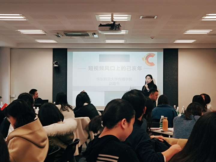 活动尹始,赵路平副教授就刚刚过去的己亥年春节里各大媒体和网络平台上的短视频进行了分析。结合央媒、上海主流媒体以及其他网络平台的“爆款”短视频,赵路平副教授立足于学界分享了她对于新闻业短视频兴起与发展的看法,同时分析了短视频与电视新闻之间的区别,最后提出了她对于短视频发展的未来展望。