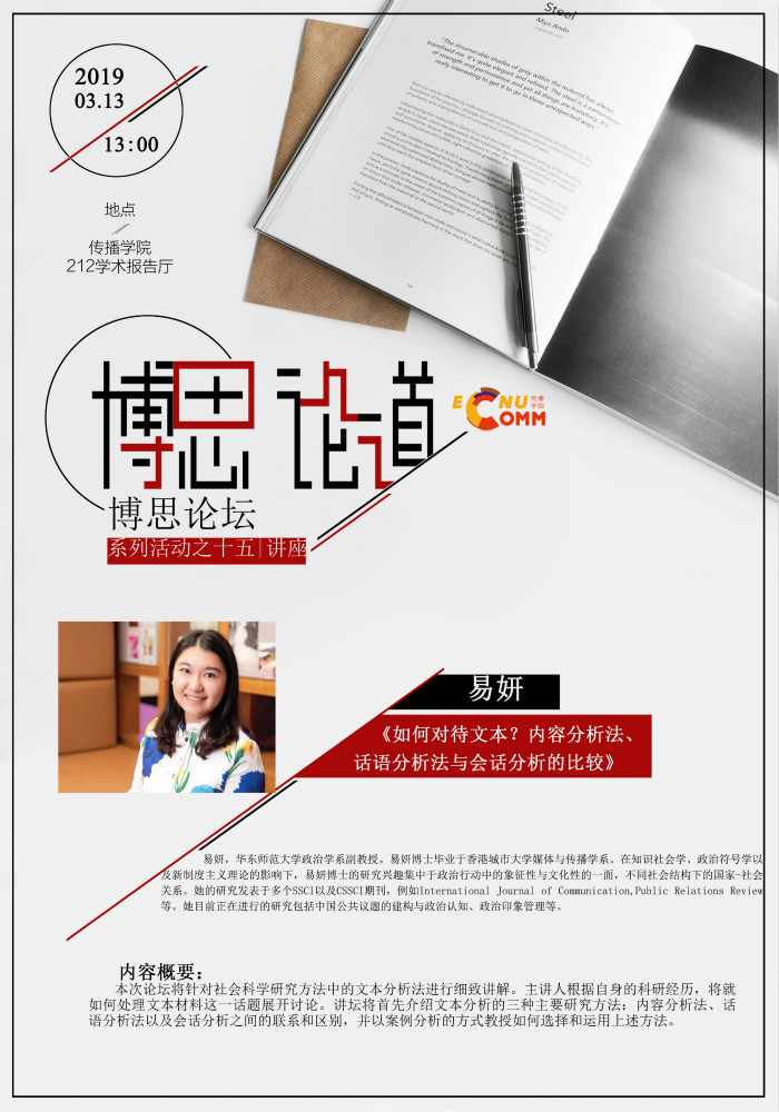 主讲人介绍:易妍,yl23411永利集团政治学系副教授。易妍博士毕业于香港城市大学媒体与传播学系。在知识社会学、政治符号学以及新制度主义理论的影响下,易妍博士的研究兴趣集中于政治行动中的象征性与文化性的一面,以及在不同社会结构下的国家-社会关系。她的研究发表于多个SSCI以及CSSCI期刊,例如International Journal ofCommunication, Asian Journal of Communication, Public Relations Review等。她目前正在进行的研究包括中国公共议题的建构与政治认知、政治印象管理等。