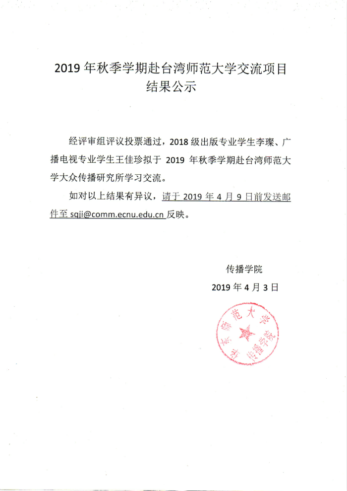 2019年秋季学期赴台湾师范大学交流项目面试结果公示