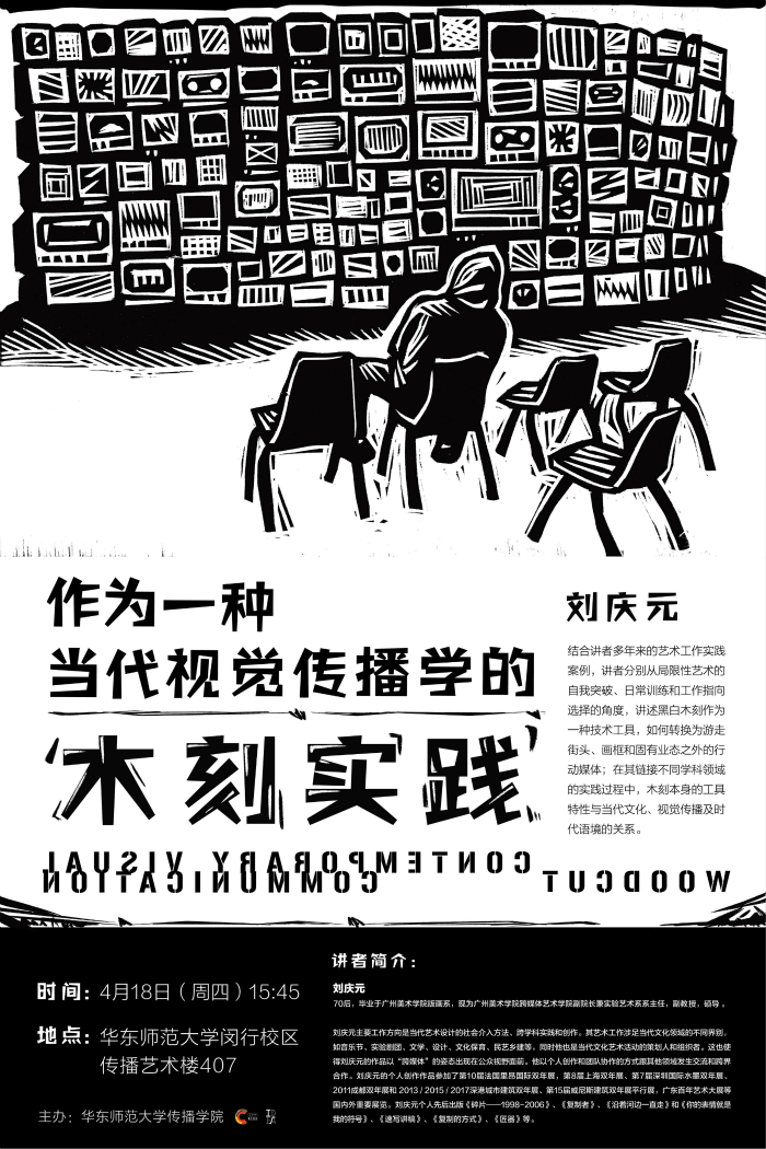 讲座内容:结合讲者多年来的艺术工作实践案例,讲者分别从局限性艺术的自我突破、日常训练和工作指向选择的角度,讲述黑白木刻作为一种技术工具,如何转换为游走街头、画框和固有业态之外的行动媒体;在其链接不同学科领域的实践过程中,木刻本身的工具特性与当代文化、视觉传播及时代语境的关系。