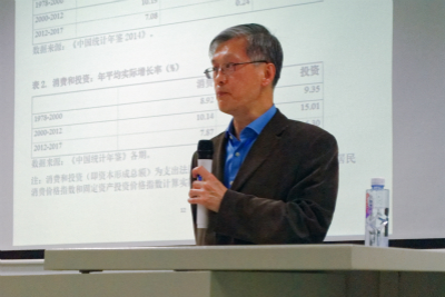 讲座开始,林哲元副教授致欢迎辞,并简单介绍了卢荻教授在研究中国经济变革方面的成就。接着卢荻教授开始了他的讲座。卢荻教授指出,2008 年世界经济进入“大衰退”以来,中国经济也经历了深刻的变化,集中表现为从快速增长急剧放缓。
