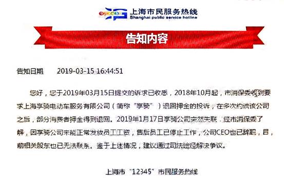 群主李女士向记者介绍,自己于3月15日向上海市民热线进行投诉,但是官方回复由于享骑2019年1月17日享骑公司突然失联,并且享骑公司未能正常发放员工工资,售后停止服务,CEO也已经辞职,建议消费者通过司法途径解决争端。因此,目前大家正打算向上海市闵行区人民法院起诉。QQ群里面已经发布了民事诉讼状的模版,维权者个人在填写后可以通过邮寄或者面交呈递给闵行区人民法院,诉讼请求包括退还押金以及账户余额,目前已经有100多人填写了诉讼状。李女士表示递交材料后法院会整理,达到一定数量以后可能会开庭。但是具体情况她并不清楚,同时,李女士认为如果公司申请破产了,那上诉的人也相应可以获得公司破产清算的一部分。群里的叶先生说自己曾经拨打消费者投诉举报专线12315进行投诉,但是该热线目前也已经不受理有关“享骑”退还押金的案件。