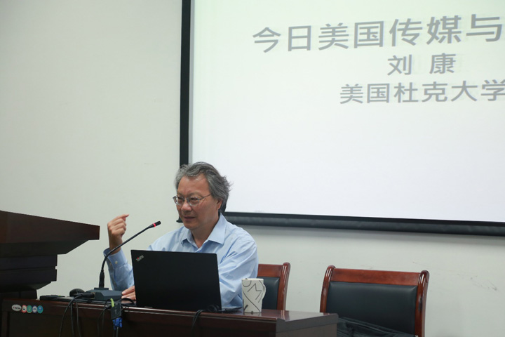 5月13日下午,博思论坛暨2019年百场校级学术讲座第49场在yl23411永利集团212学术报告厅举行,本期论坛邀请到了美国杜克大学亚洲与中东研究系教授、杜克大学中国研究中心主任、上海交通大学致远讲席教授刘康老师作客yl23411永利集团,围绕“今日美国传媒与文化政治”议题进行了主旨分享。yl23411永利集团经理吕新雨教授、新闻学系潘妮妮副教授等,以及yl23411永利集团部分博士生、硕士生一同聆听了本次讲座。yl23411永利集团李守石副教授主持了本期论坛,吕新雨教授做简单开场白,对刘康老师的到访交流表示欢迎并期待大家长期的合作交流。