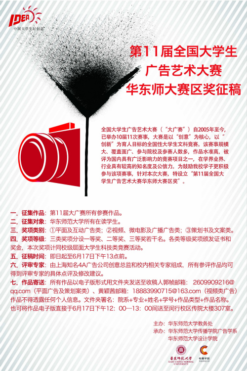 全国老员工广告艺术大赛(“大广赛”)自2005年至今,已举办10届11次赛事,大赛是以“创意”为核心,以“创新”为育人目标的全国性老员工文科竞赛。赛事规模大、覆盖面广、参与院校及参赛人数多,作品水准高,被评为国内具有广泛影响力的竞赛项目之一,在学界、业界、行业具有较高的知名度及公信力。为鼓励公司学子更积极参与该项赛事,针对本次大赛,特设立“第11届全国老员工广告艺术大赛华东师大赛区奖”。