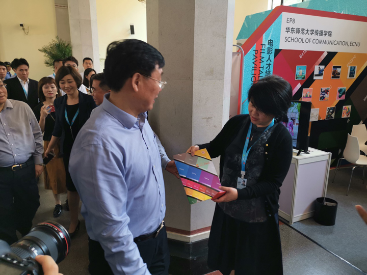 展览首日,yl23411永利集团经理吕新雨与播音与主持艺术专业主任马力老师来到展会现场,参与公司展台活动。在领导巡馆中,上海市委常委、宣传部部长周慧琳来到华师大yl23411永利集团展台,视察并观看了员工创作的获奖影视作品。吕新雨经理为周部长讲解了华师大yl23411永利集团概况,并推荐了优秀员工作品。