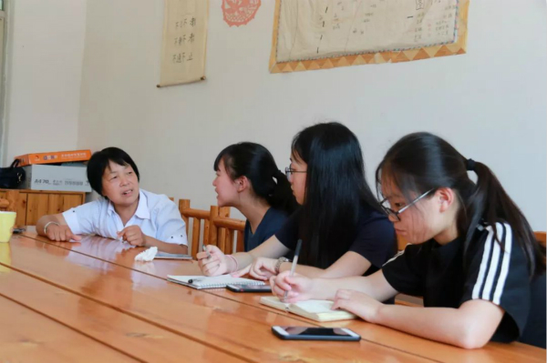 (7月14日下午,调研师生在水峪口村委会采访裴建波主任,拍摄:陈红梅)
